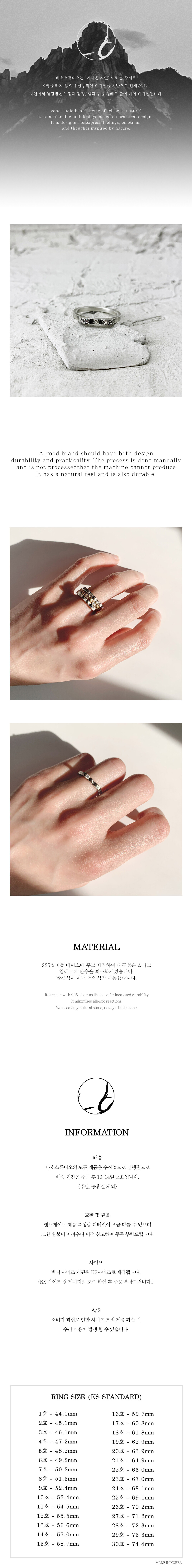 mountain peaks ring입니다. 광활한 산맥에서 영감을 받아 디자인하였으며 바호스튜디오 만의 감성으로 디자인된 세 개의 봉우리 중 하나의 봉우리에 큐빅이 박혀있으며 음각과 양각이 도드라진 유니크 반지입니다. 매우 얇게 디자인되어 데일리 혹은 커플링으로도 착용하기 좋으며 같은 시리즈인 Mountain ridge ring과 함께 레이어드 하면 더욱 예쁘게 착용 가능합니다. 큐빅을 붙이는 과정도 본드로 붙이는 것 이 아닌 발을 만들어 큐빅을 넣는 방식을 사용하여 디자인은 물론 내구성 또한 신경 썼습니다.