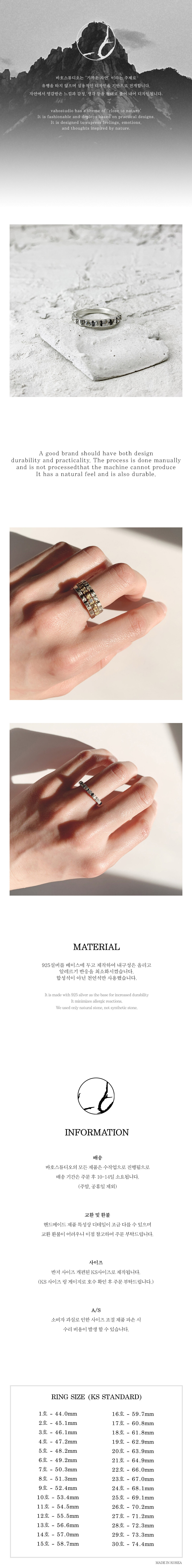 mountain ridge ring입니다. 광활한 산맥에서 영감을 받아 디자인하였으며 바호스튜디오 만의 감성으로 디자인된 다섯 개의 봉우리의 사이사이 다섯 개의 큐빅이 박혀 있어 음각과 양각이 도드라진 유니크한 반지입니다. 매우 얇게 디자인되어 데일리 혹은 커플링으로 도 착용하시기 좋으며 같은 시리즈인 mountain peaks ring과 레이어드 하면 더욱 예쁘게 착용 가능합니다. 큐빅을 붙이는 과정도 본드로 붙이는 것 이 아닌 발을 만들어 큐빅을 넣는 방식을 사용하여 디자인은 물론 내구성 또한 신경 썼습니다.
